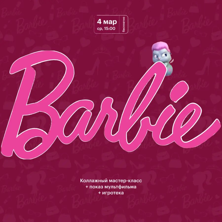 15:00 — мастер-класс по коллажам. Создадим собственные коллажи по мотивам вселенной Барби. Все материалы предоставляются.