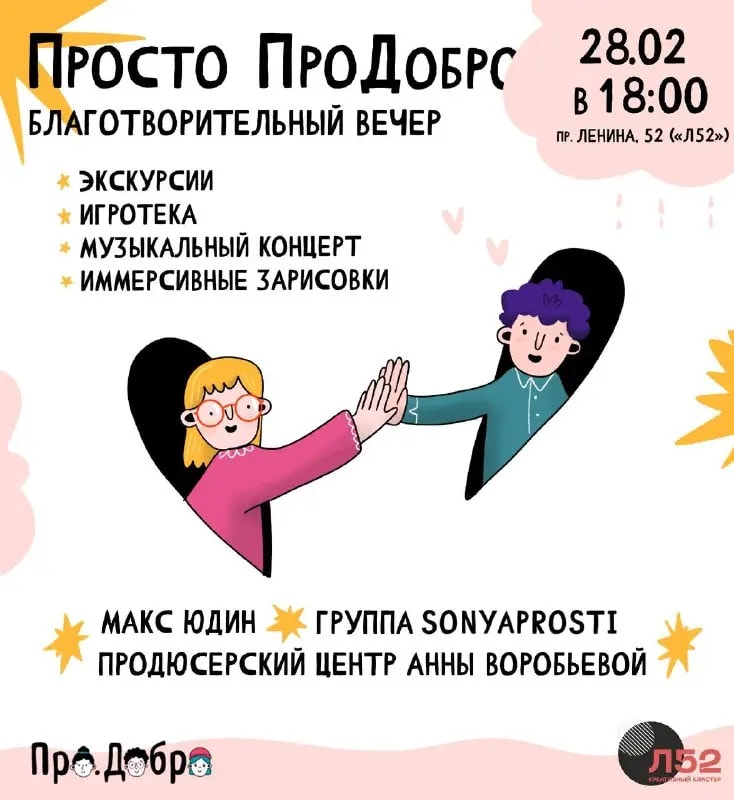 28 февраля с 18:00 до 21:00 в креативном кластере «Л52» (вход с ул. Бажова, 124А) пройдёт благотворительный вечер «Просто ПроДобро». Мероприятие завершит работу трёхмесячной выставки, погружавшей горожан в инклюзивную среду Екатеринбурга, и соберёт средства на обустройство обеденной зоны в инклюзивной мастерской «ПроДобро» — месте работы людей с инвалидностью.