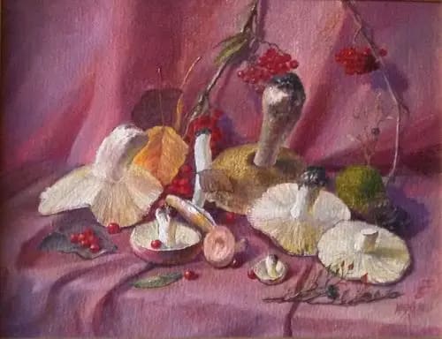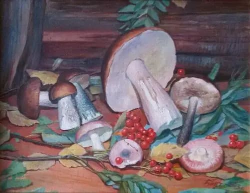 В русском искусстве тему подхватывает такой выдающийся мастер, впоследствии завсегдатай настенных календарей, как Иван Хруцкий: «Грибы, рыба и овощи» (1838), «Натюрморт с грибами» (1842). К нему присоединяются Фома Торопов, любивший разбавить грибочками фруктовое изобилие, Гавриил Конратенко, нарисовавший еще несрезанные «Белые грибы» (1894). Встречаются у наших художников и жанровые картины про тихую охоту: «За грибами» (1870) у Ивана Шишкина или «Девушка с грибами под радугой» (1922) у Константина Сомова, «В лесной чаще» (1895) Николая Бодаревского, «Старушка с грибами» (1911) Николая Богданова-Бельского, «Сбор грибов лесу» (1927) Сергея Виноградова и «Летом» (1954) Аркадия Пластова.