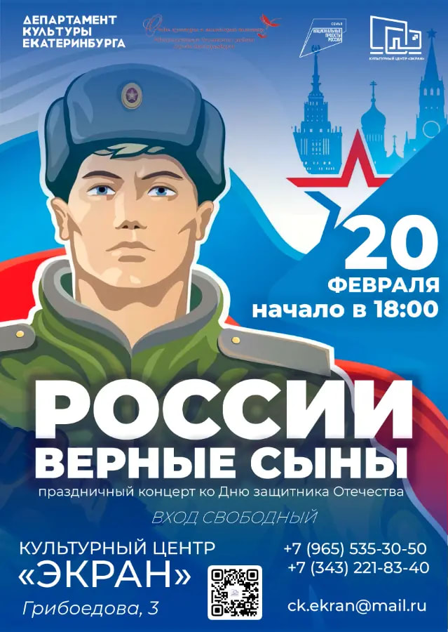 20 февраля в 18:00 приглашаем на концертную программу «Верные сына России», посвящённую Дню защитника Отечества.