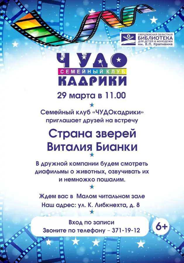 Ждём малышей и их родителей 29 марта в 11.00 в семейном клубе «ЧУДОкадрики» на познавательную встречу «Страна зверей Виталия Бианки».