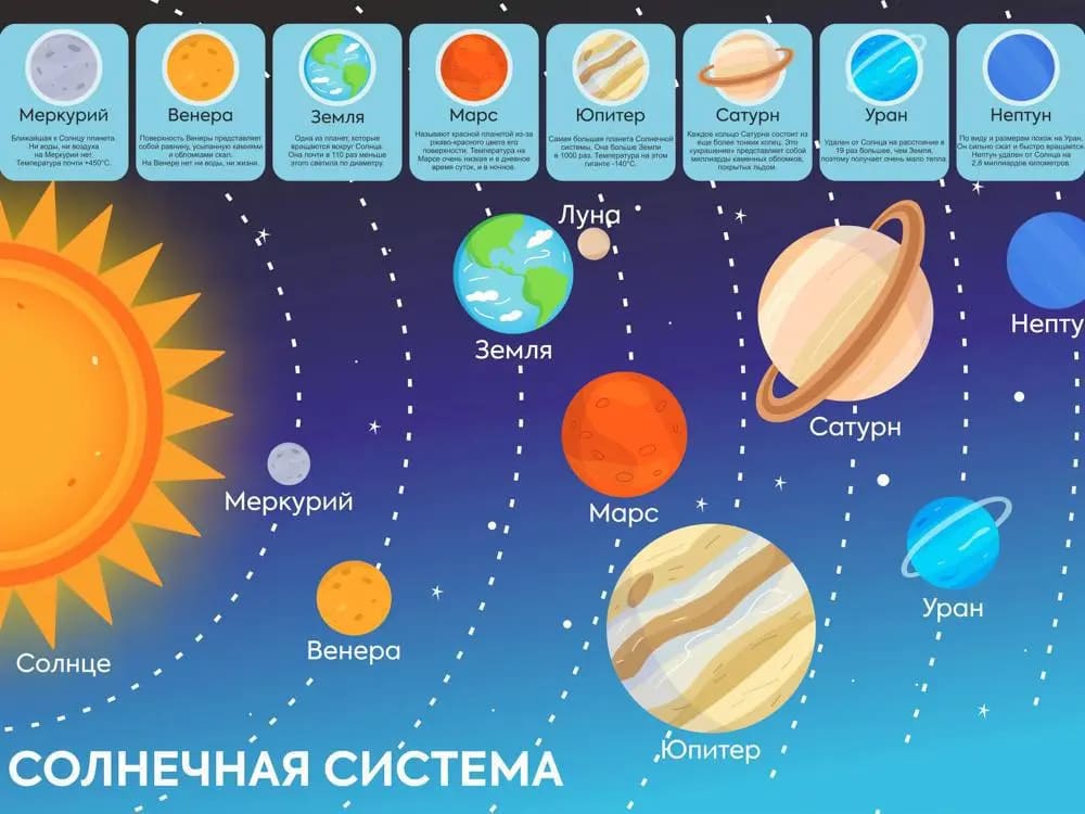 - Поговорим про состав Солнечной системы: Солнце и 8 планет.