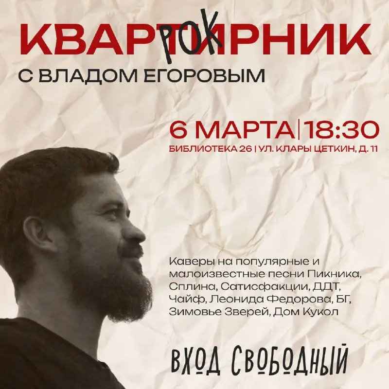 БесплатноКонцерты0Квартирник с Владом Егоровым 6 марта18:30 — 20:00улица Клары Цеткин, 11БесплатноПосмотреть