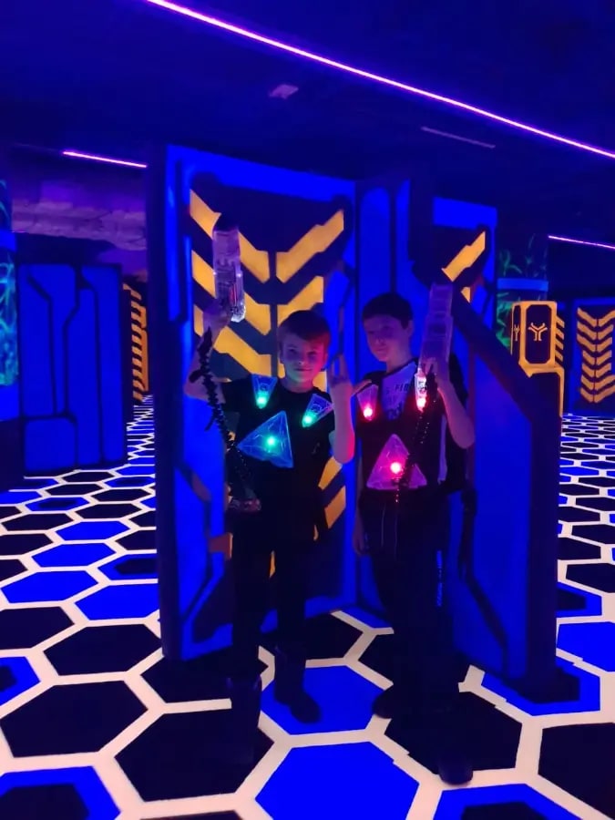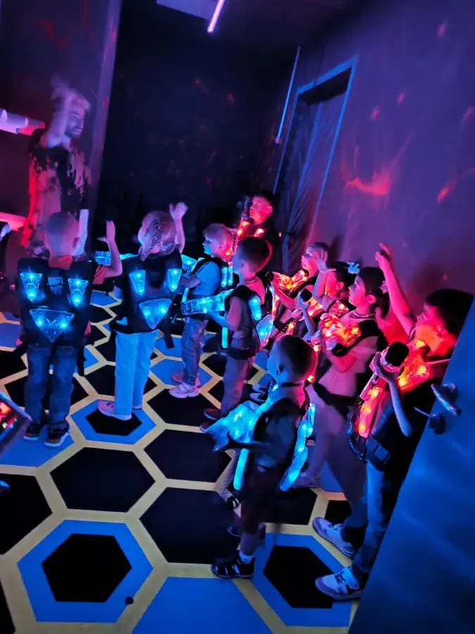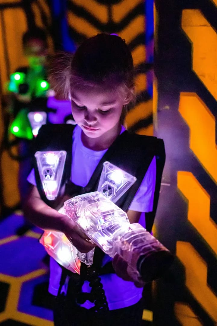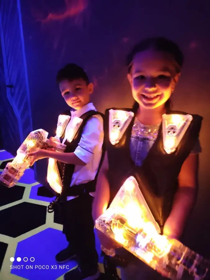 Самый масштабный космический лазертаг в Казани. Вы оказываетесь в настоящей космической станции с 4 аренами, включая огромные зоны на Казань Арене! Дети вместе с друзьями или семьёй бегают, прячутся, стреляют в лазерных баталиях (командные сценарии, захват флага, выживание, миссии), используют укрытия, спецэффекты и шок-браслеты (лёгкие вибрации для остроты). Здесь есть лазерный лабиринт, VR-зона, аэрохоккей, кнопочные бои, игровые аппараты, аттракционы и банкетные залы для ДР. Постановка по высокотехнологичным сценариям: инструкторы выдают оборудование (лёгкие жилеты + оружие), объясняют правила, запускают игры и мотивируют прямо на арене. Атмосфера полная адреналина и восторга. Дети уходят только радостные, родители тоже.