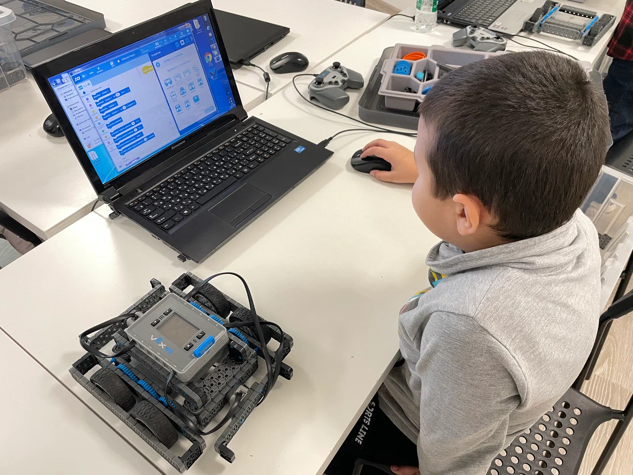 Единственный клуб в Казани, который работает на профессиональных наборах VEX (VEX IQ для младших, VEX EDR для старших). Это уровень международных соревнований WRO/RoboCup! Дети от 5 до 16 лет собирают реальных программируемых роботов уже на первом занятии: механизмы, датчики, моторы, колёса, манипуляторы. Программирование через блочные среды (для малышей) и текстовой код (Python-подобный для продвинутых). Занятия развивают инженерию, логику, физику, математику и командную работу — дети создают роботов для миссий, участвуют в соревнованиях, хакатонах и фестивалях. Атмосфера — чистый восторг: командные победы, презентации проектов. Родители говорят: «ребёнок в полном восторге», «ходит с улыбкой», «лучше обычных кружков — реальные роботы и соревнования»!