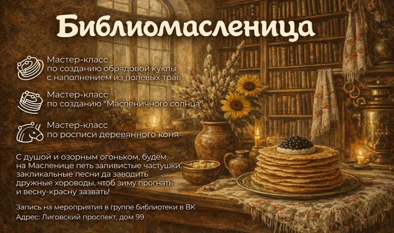 Библиотека «Лиговская» приглашает детей и взрослых на масленичные гулянья с народными традициями, творческими мастер-классами и фольклорной программой.