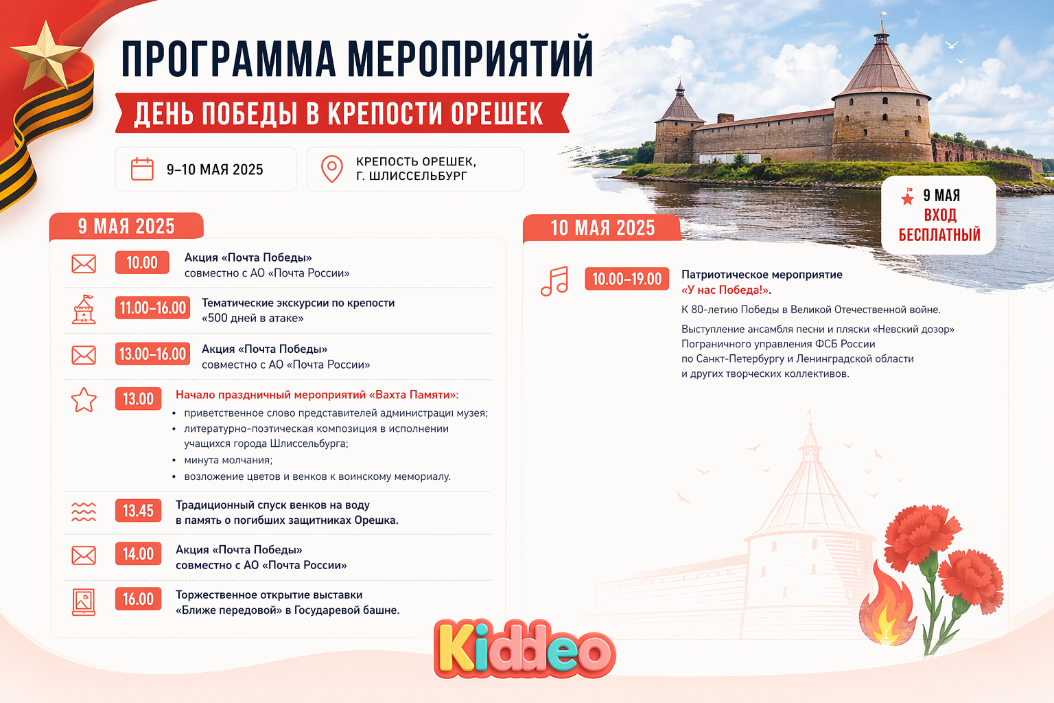 9 и 10 мая в легендарной крепости Орешек пройдут памятные и праздничные мероприятия, посвящённые годовщине Победы в Великой Отечественной войне. Это возможность совместить семейную поездку с важной историей и атмосферой одного из самых значимых мест Ленинградской области.