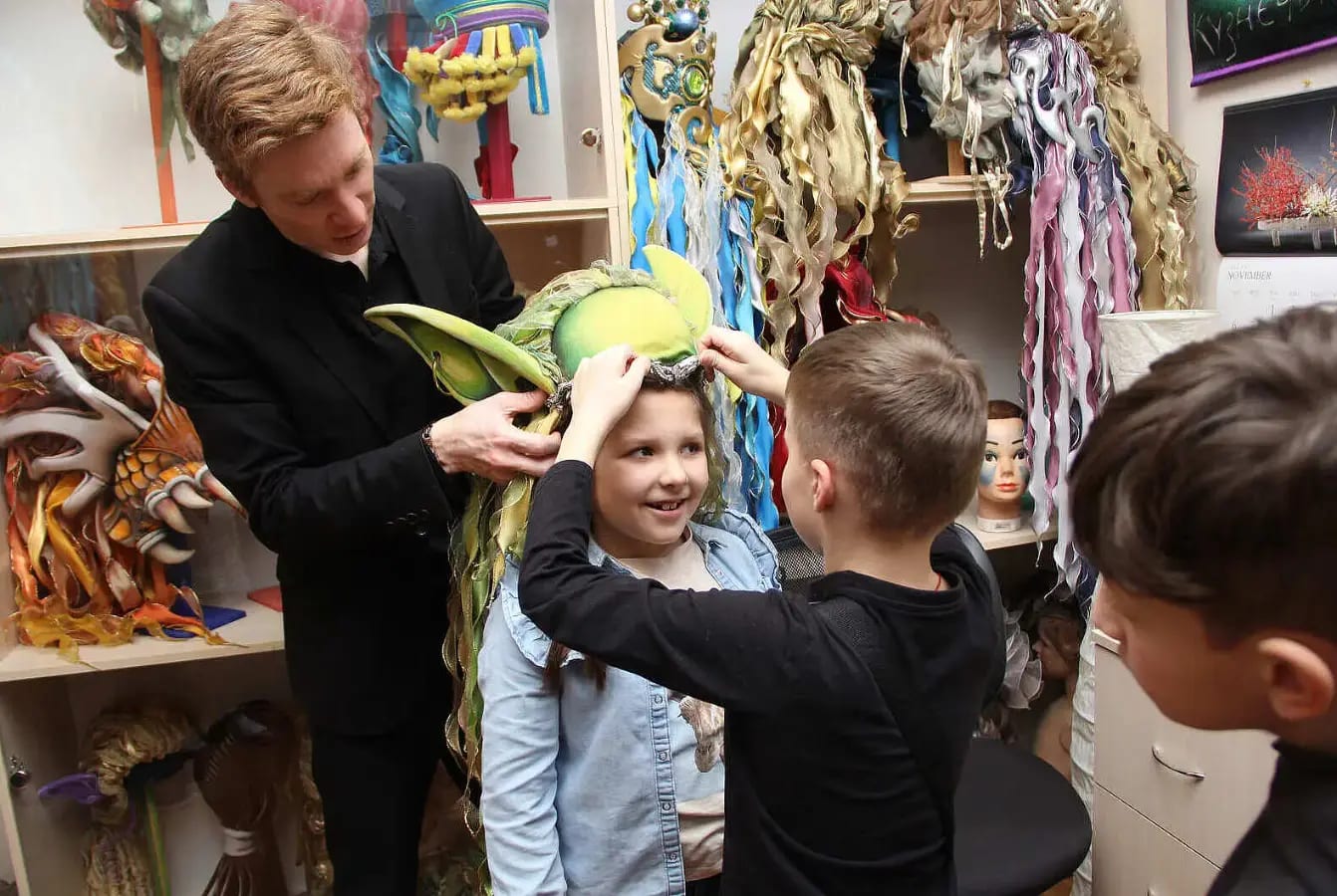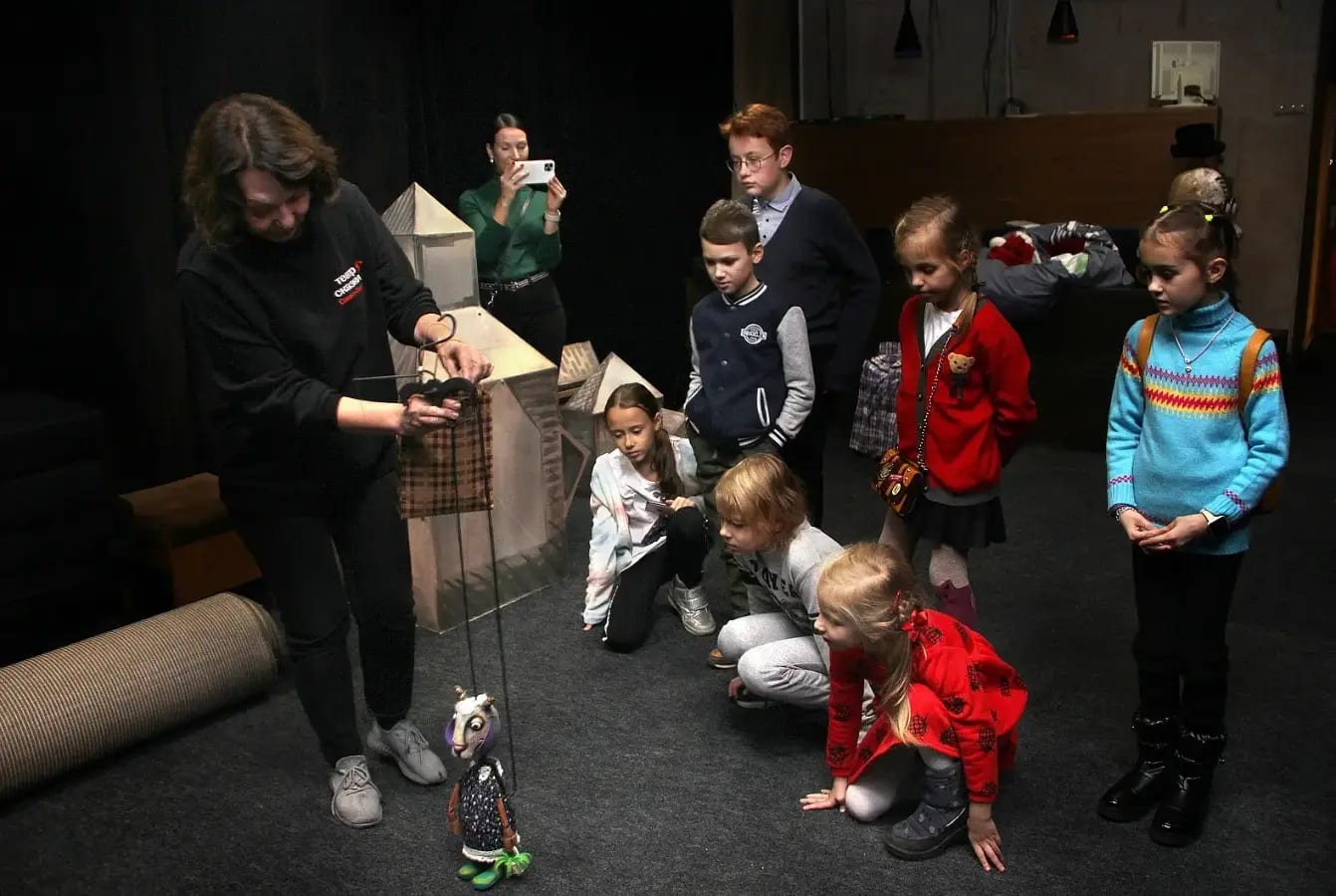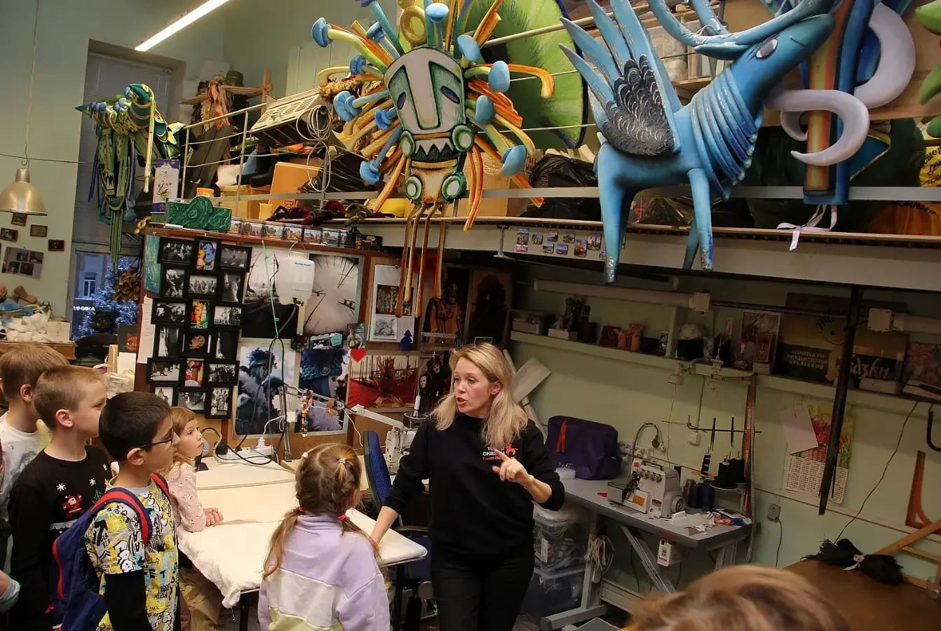 Посещение мастерских: юные гости побывают в настоящих рабочих пространствах — у бутафоров, технолога театрального костюма, конструктора кукол, декоратора, столяра, гримёра, постижёра и других мастеров.