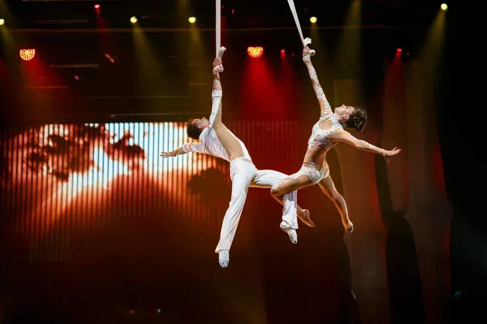 На сцене выступает один из титулованных цирковых дуэтов Санкт-Петербурга. Артисты участвовали в международных цирковых проектах и работали на европейских площадках, включая Упсала-Цирк в Германии и зарубежные гастрольные шоу.