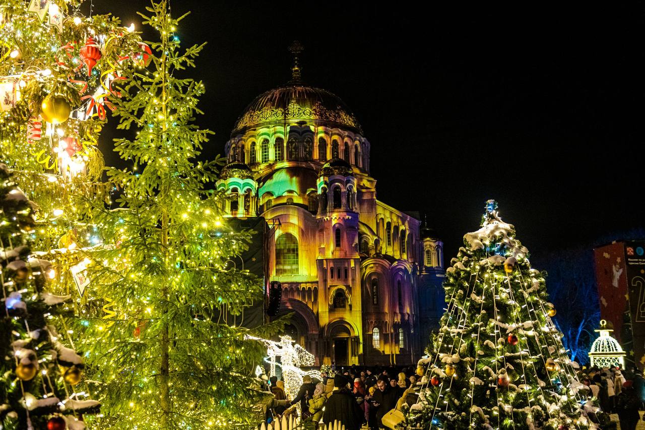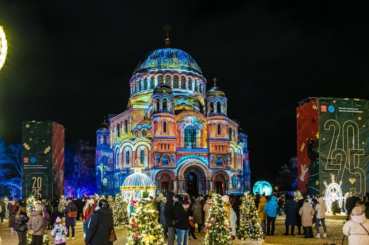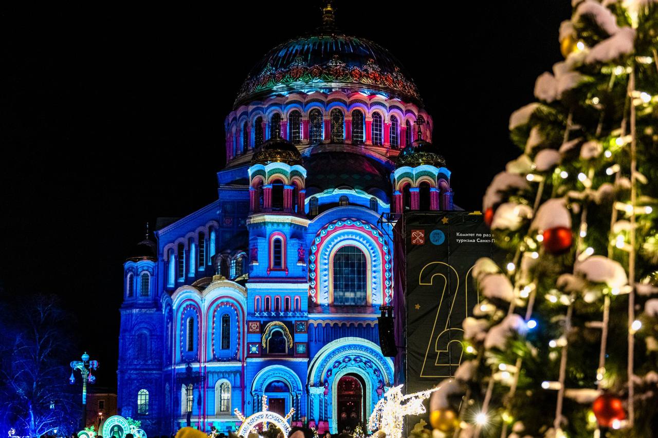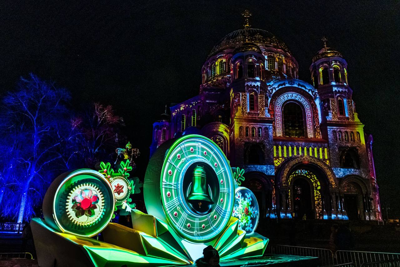Якорная площадь Кронштадта превратится в праздничный зимний городок, где на фасаде Никольского морского собора ежедневно будет проходить уникальное мультимедийное световое шоу с яркими проекциями в рождественском стиле.