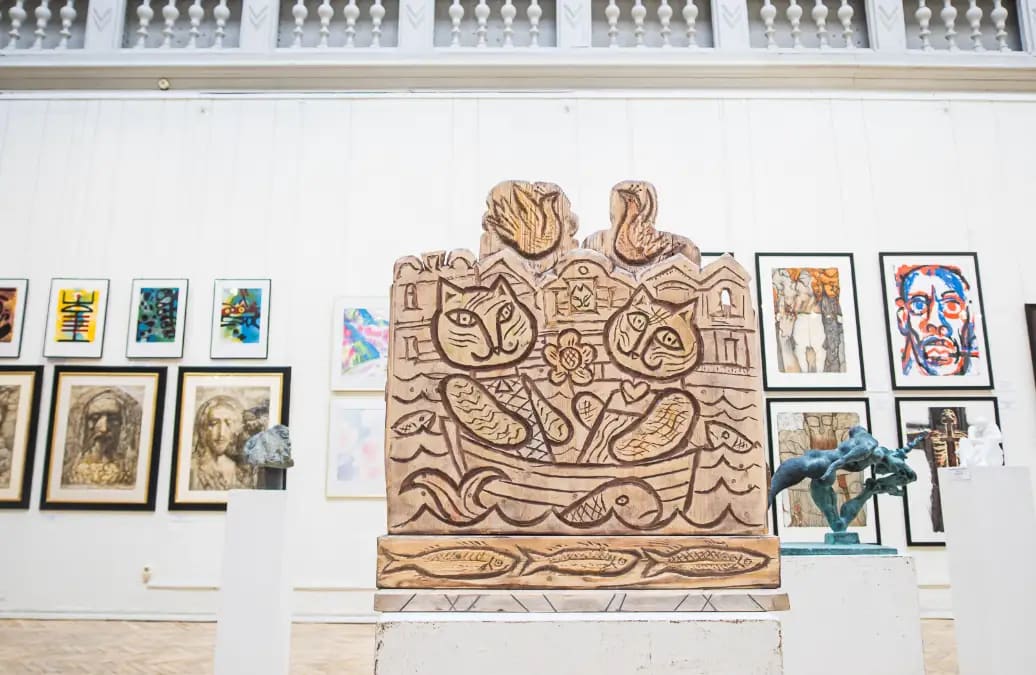 Экспозиция объединяет разные направления: графику, фотографию, плакат, скульптуру и керамику. Здесь можно увидеть как классические техники (акварель, пастель, линогравюра), так и современные эксперименты.