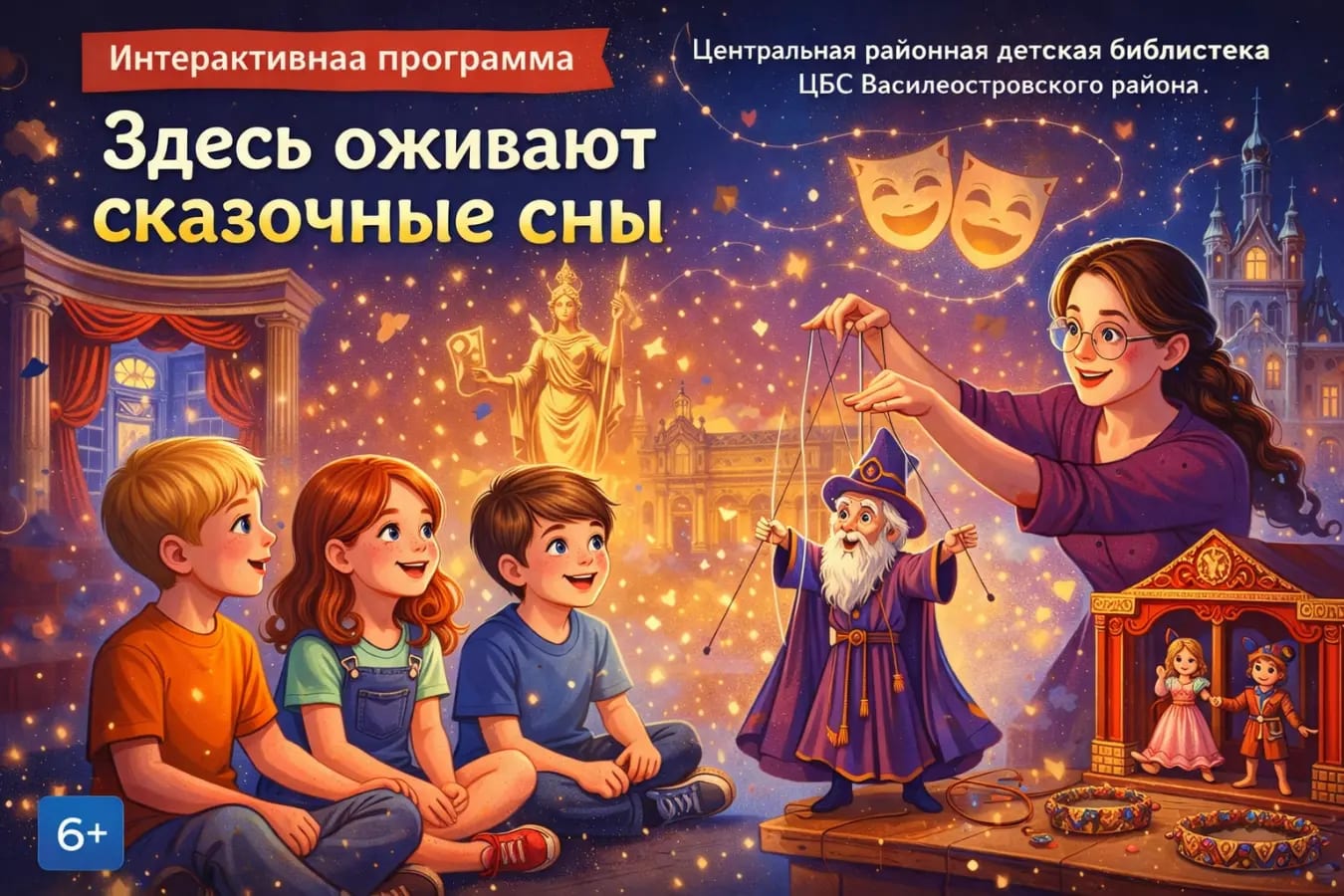 Познавательная программа к Международному дню театра, где дети в игровом формате знакомятся с миром сцены.