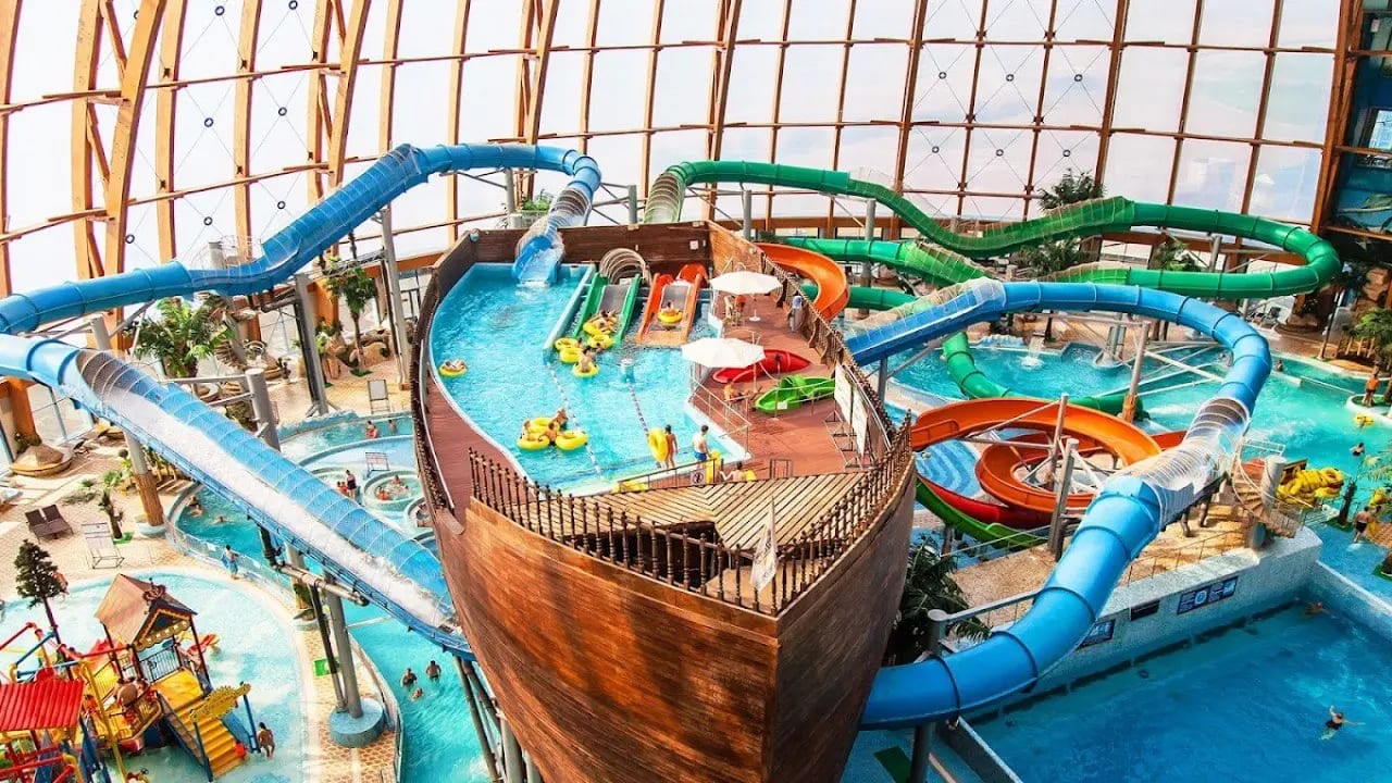 Самый масштабный крытый аквапарк в России (25 000 кв.м, до 2000 гостей одновременно): это не просто бассейны — вы в пиратском мире с тропическими пейзажами, где семьи ныряют в волны, а экстрим-любители покоряют горки! Дети осваивают детский городок с мини-горками, мини-бассейнами и водными пушками, взрослые мчатся по 5 эпичным горкам — «Синяя» (с 10 лет, на ватрушках вверх по струям), «Оранжевая» (с 8 лет, спиральный вихрь), «Черная дыра» (темная туннельная с эффектами), «Камикадзе» (вертикальный обрыв) и «Синтетическая волна» (для серфинга). Под теплой водой +27°C — «Ленивая река» для релакса, 6-метровый дайвинг-пул для погружений, банный комплекс с 13 видами саун и хаммамов, плюс шезлонги и кафе с видом на хаос брызг. Тематика пиратская: огромный корабль-аттракцион, где все как в сказке — без кричащих аниматоров, только чистый драйв и безопасность (электронный контроль на горках). Атмосфера — взрыв эмоций и смеха, семьи в восторге (отзывы: "лучший семейный отдых в Питере, дети не вылезают из воды!"), родители тоже (многие говорят, что это круче зарубежных аквапарков — ближе, теплее и веселее!).