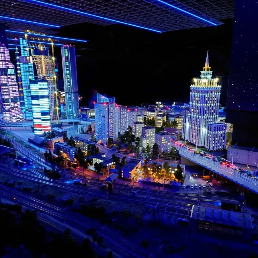Самый большой макет России (800 м²) и один из крупнейших в мире. Здесь вся страна в масштабе 1:87 — от Калининграда до Камчатки, с городами, горами, лесами, морями и реками. Вы увидите движущиеся поезда, автомобили (с реалистичным трафиком), корабли, люди в повседневной жизни — стройки, фермы, праздники, даже юмористические сценки. Каждые 13 минут — смена дня и ночи с потрясающими световыми эффектами: закаты, огни городов, северное сияние. Интерактив: кнопки для запуска действий (пожарные едут тушить, тракторы работают). Дети остаются в восторге от поиска деталей и "управления" миром.